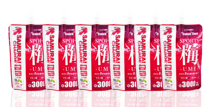 サムライチャージとは、群馬県高崎産の白加賀梅の果肉入りスポーツゼリー飲料です。クエン酸3,000mgとBCAA必須アミノ酸3,000mgを配合し、